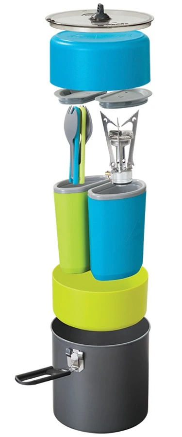 Designed to cater to 2 persons, the kit contains two Deepdish bowls with colour-matching insulated mugs and folding sporks. Everything nests inside a 2-litre hard-anodized aluminium pot to create an impressively lightweight and space-efficient kit for backpacking and camping duos.