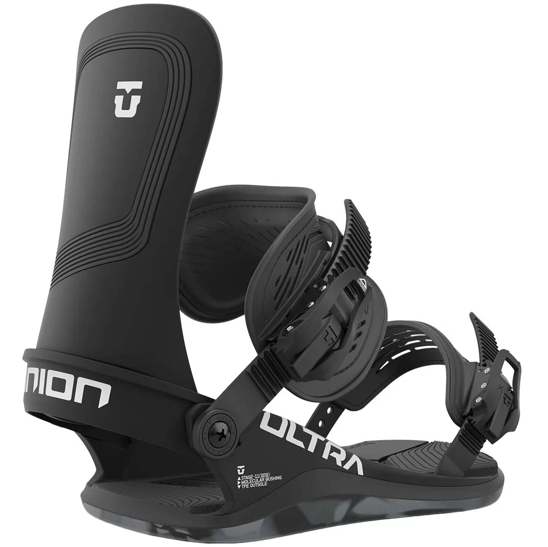 The Ultra bindings come equipped with Unions Stage 11 ASYM Duraflex ST Baseplate. By removing excess material in the toe and heel areas of the base plate, Union has created an innovative asymmetric design that drastically improves the torsional flex of the binding and provides a 360-degree board flex and feel. This, combined with Union’s exclusive TPE Outsole technology further improves the bindings dampening and vibration-cancelling properties as this manufacturing process negates the need to apply bushing glue.